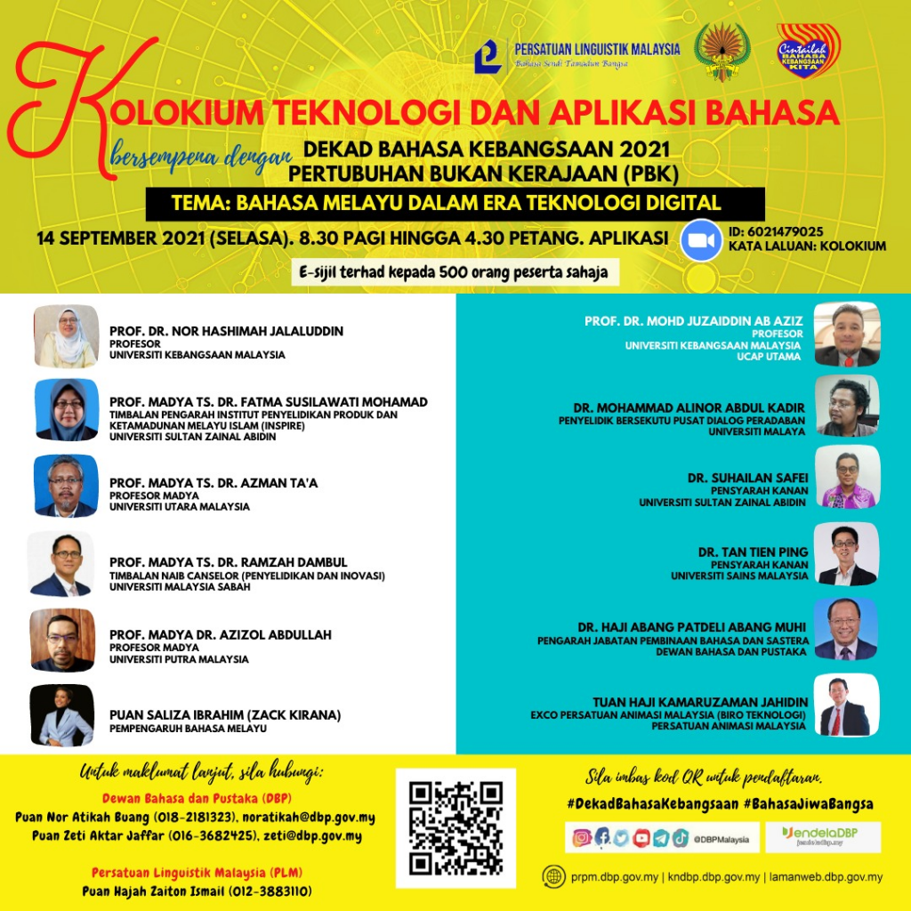 Kolokium Teknologi dan Aplikasi Bahasa anjuran Dewan Bahasa dan Pustaka dengan kerjasama Persatuan Linguistik Malaysia bersempena dengan Dekad Bahasa Kebangsaan 2021 Peringkat Pertubuhan Bukan Kerajaan akan diadakan pada 14 September 2021 (Selasa), pukul 8.30 pagi hingga 4.30 petang menerusi aplikasi Zoom.
