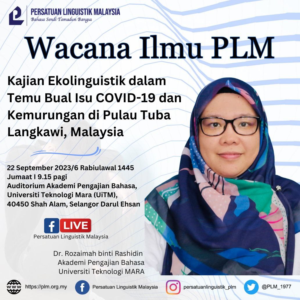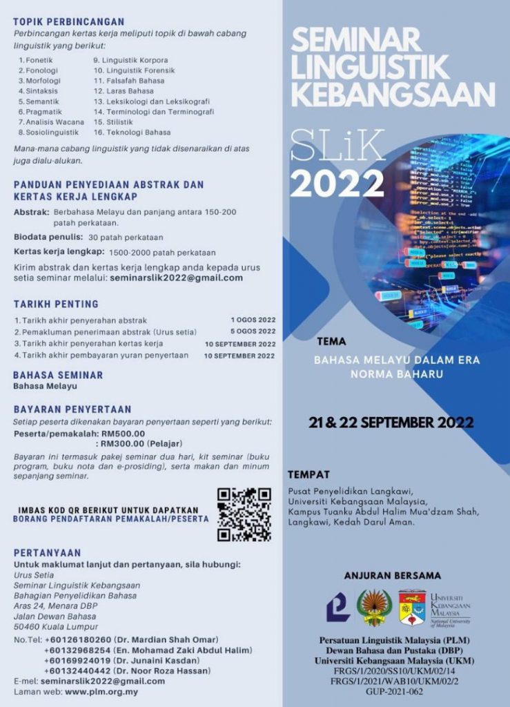 Tema: Bahasa Melayu Era Norma Baharu Tarikh: 21 & 22 September 2022 Tempat: Pusat Penyelidikan Langkawi, Universiti Kebangsaan Malaysia, Kampus Tuanku Abdul Halim Mua’dzam Shah, Langkawi, Kedah Darul Aman. Anjuran Bersama: Persatuan Linguistik Malaysia (PLM), Dewan Bahasa Dan Pustaka (DBP), Universiti Kebangsaan Malaysia (UKM)