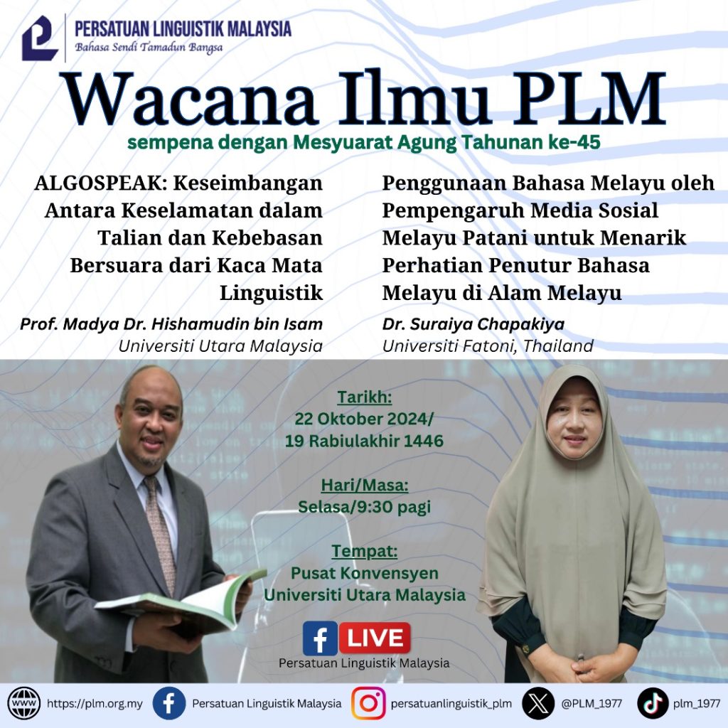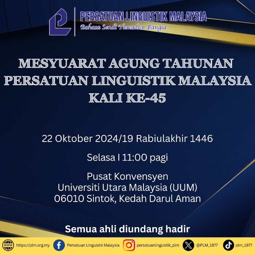 MESYUARAT AGUNG TAHUNAN PERSATUAN LINGUISTIK MALAYSIA KALI KE-45 22 Oktober 2024/19 Rabiulakhir 1446 Selasa | 11.00 pagi Pusat Konvensyen Universiti Utara Malaysia (UUM) 06010 Sintok, Kedah