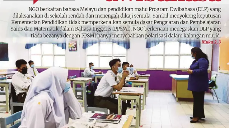 NGO berkaitan bahasa Melayu dan pendidikan mahu Program Dwibahasa (DLP) yang dilaksanakan di sekolah rendah dan menengah dikaji semula. Sambil menyokong keputusan Kementerian Pendidikan tidak memperkenalkan semula dasar Pengajaran dan Pembelajaran Sains dan Matematik dalam Bahasa Inggeris (PPSMI), NGO berkenaan menegaskan DLP yang tiada bezanya dengan PPSMI hanya menyebabkan polarisasi dalam kalangan murid.